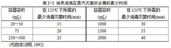滅菌器內(nèi)冷空氣,以便使蒸汽能到達各個消毒部位,保證消毒滅菌徹底。然后繼續(xù)加壓加熱,當(dāng)壓力表讀數(shù)達到1.0~1.1 kg/cm2為121 ºC,保持15~20 min即可。由于消毒滅菌效果取決于溫度而不是壓力,所以在一定壓力下保持較長的消毒滅菌時間是必須的。在121 ºC的蒸汽溫度下可以很快殺死各種細(xì)菌及高度耐熱的芽孢桿菌,因此許多培養(yǎng)液的消毒滅菌壓力、溫度一般保持在1.0~1.1 kg/cm2、121 ºC。消毒滅菌時間與需要消毒滅菌的培養(yǎng)液量密切相關(guān)(表2-3),時間不足達不到滅菌效果,時間過長培養(yǎng)液內(nèi)的一些化學(xué)物質(zhì)遭到破壞,影響培養(yǎng)液成分。消毒滅菌結(jié)束后,關(guān)閉熱源,只有當(dāng)