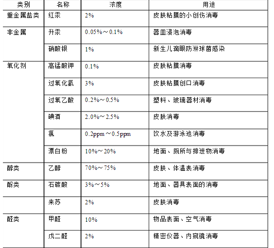 具有殺死微生物的化學藥物稱消毒劑。消毒劑對人體有毒性作用,只能外用,不能內服。主要用于皮膚粘膜的傷口、器械、排泄物和周圍環境的消毒。消毒劑在低濃度時也可作防腐用,但防腐劑的關鍵是應要對人體無毒性作用。消毒劑種類濃度與用途見表 13-1。                        常用消毒劑的種類濃度與用途