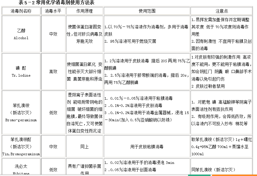 (3)需消毒的物品應洗凈擦干,浸泡時打開軸節,將物品浸沒于溶液里。 (4)消毒劑應定期更換,揮發劑應加蓋并定期測定比重,及時調整濃度。 (5)浸泡過的物品,使用前需用無菌等滲鹽水沖洗,以免消毒劑刺激人體組織。 2.常用化學消毒滅菌方法