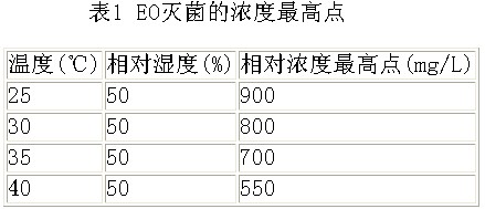 3 環(huán)氧乙烷的控制參數(shù) EO滅菌過程關(guān)鍵參數(shù)的控制是達到滅菌質(zhì)量的保證其滅菌的關(guān)鍵參數(shù)為EO的濃度、滅菌時腔體內(nèi)的濕度、溫度和時間。這些關(guān)鍵因素直接影響滅菌的效果;每個關(guān)鍵因素在程度上可有所不同,但相互之間必須達到平衡。